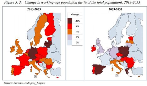 En las imágenes, se divide a los países europeos en función de sus tendencia demográficas. Se mide el cambio en la población en edad de trabajar (entre 20 y 64 años, en este caso) como porcentaje del total de la población desde el año 2013 al año 2053. Como vemos, en España el peso de este grupo de población caerá alrededor del 6% en las próximas dos décadas y más del 10% desde 2033 a 2053. Sólo Grecia y Polonia presentan un panorama parecido.