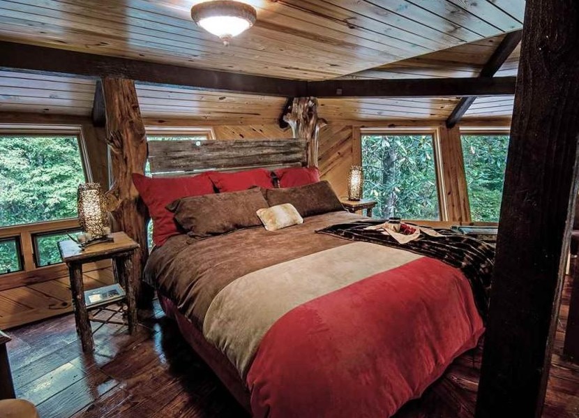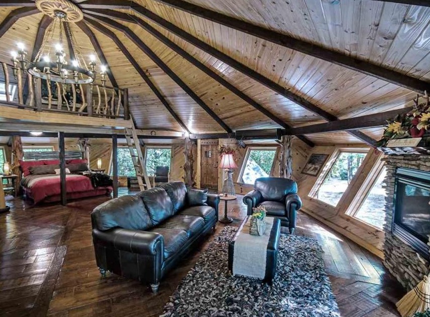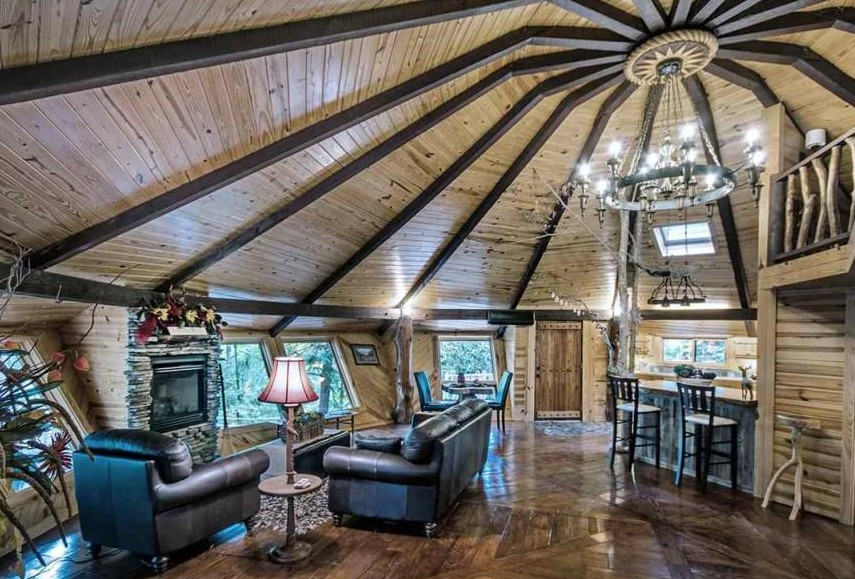 Esta espectacular casa del árbol cuenta con habitación, baño y un salón-cocina con chimenea