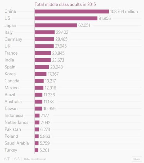 China posee la clase media más numerosa del mundo, con 109 millones de personas, superando en el ranking mundial a EEUU por primera vez en la historia, con casi 92 millones de norteamericanos, según el informe sobre riqueza global elaborado por Credit Suisse.