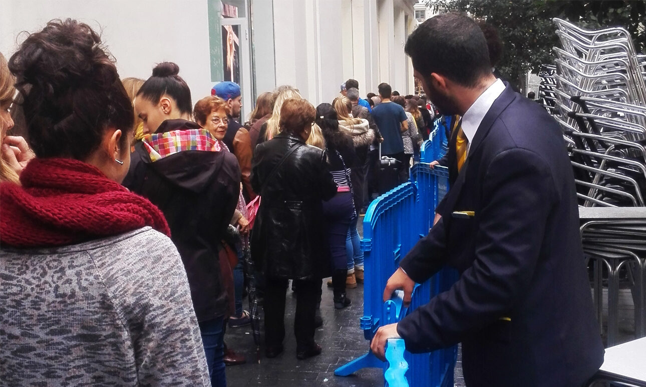 Cada parte de la fila está controlada por un responsable de seguridad. En uno de los tramos de la calle Mesonero Romanos, el camarero de la terraza de enfrente solicita a los responsables de la tienda que no ocupen con las vallas su parte reservada a la terraza. Ellos acceden y hacen un poquito más estrecha la fila. "El jueves fue un caos", relata el encargado de la terraza, "pero ahora ya va mejor, además, con la apertura, está viniendo más clientela al bar", añade.
