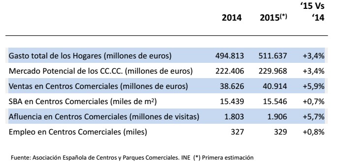 Por otro lado, el parque de centros comerciales ha continuado su expansión, produciéndose dos actuaciones en 2015 (ampliaciones e inauguraciones), y aumentando la superficie bruta alquilable en 47.000 m2. Asimismo esperan que se produzcan otras dos operaciones en lo que queda de año y que el mercado español cierre 2015 con 549 centros comerciales operativos con una superficie bruta alquilable de 15,55 millones de metros cuadrados. Estas cuatro operaciones se producirán en centros de talla mediana.