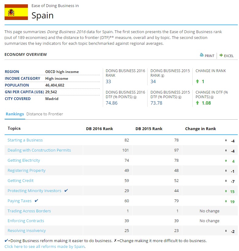 España ha subido un puesto en el ranking Doing Business que elabora anualmente el Banco Mundial, hasta la posición 33, que mide la facilidad para hacer negocios en más de 180 países alrededor del globo. El índice de 2016, con datos correspondientes al pasado mes de junio, sitúa a la economía nacional entre Japón (34) y las Islas Mauricio (32).