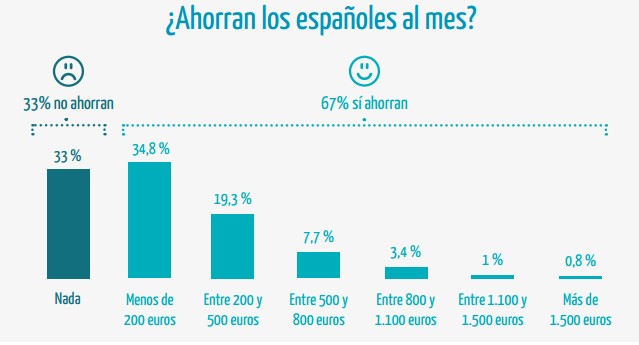 En esta misma línea, el estudio de Rastreator detalla que un 67% de los españoles ahorra algo de dinero cada mes frente a un 33% que reconoce que no es capaz de ahorrar nada. Y, entre los ahorradores, un 54% ahorra menos de 500 euros mensuales.