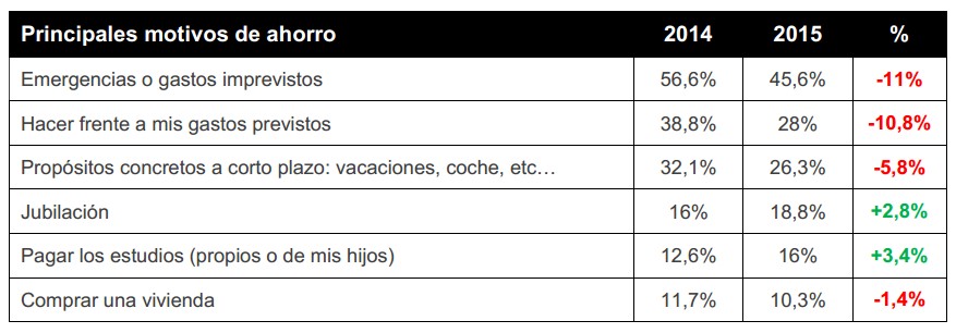 Por su parte el estudio elaborado por Aviva destaca que, al igual que sucedió en 2014, este año el principal motivo para ahorrar sigue siendo hacer frente a gastos imprevistos, seguido a continuación de los gastos previstos. No obstante, ambas partidas han descendido considerablemente respecto al año pasado. Por el contrario, las únicas partidas que aumentan en 2015 son el ahorro para la jubilación y los estudios.
