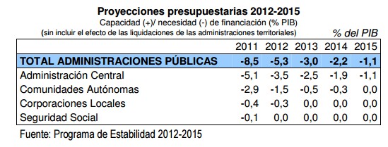 Poco duró la apuesta. En la primavera de 2012, Rajoy elevó de forma unilateral el objetivo de déficit al 5,8% en 2012, manteniendo la meta inicial del 3% para 2013. Tras presionar y negociar con Bruselas, el PP logró, finalmente, acordar con la Comisión Europea un objetivo del 5,3% para 2012 (desde el 4,4% inicial) y del 3% para 2013, mientras que preveía un agujero del 2,2% en 2014 y del 1,1% en 2015, tal y como refleja el Programa de Estabilidad 2012-2015, el primero elaborado por el ministro de Hacienda, Cristóbal Montoro.