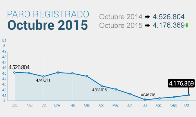 Por un lado, el número de parados registrados en las oficinas de los servicios públicos de empleo (antiguo Inem) aumentó en 82.327 personas en octubre, un 2% respecto al mes anterior, hasta un total de 4.176.369 personas, según informó este martes el Ministerio de Empleo. Dicho incremento es ligeramente superior al de octubre de 2014 (+79.154), aunque se queda por debajo del registrado en el mismo mes de 2013 (+87.028). En el último año, el paro acumula un descenso de 350.435 personas, equivalente al 7,74%, el mejor resultado en un mes de octubre dentro de la serie histórica.