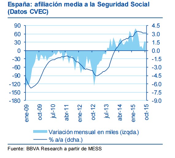 Octubre no suele ser un buen mes en materia laboral, ya que siempre sube el paro, y éste no ha sido distinto. El dato clave, sin embargo, radica en el ritmo de creación de empleo, puesto que constituye un indicador bastante fiable sobre la tendencia del PIB. En los últimos tres meses, las afiliaciones a la Seguridad Social ya venían avanzando una ralentización del crecimiento económico en la segunda mitad del año, y octubre, en principio, ratifica esta previsión.