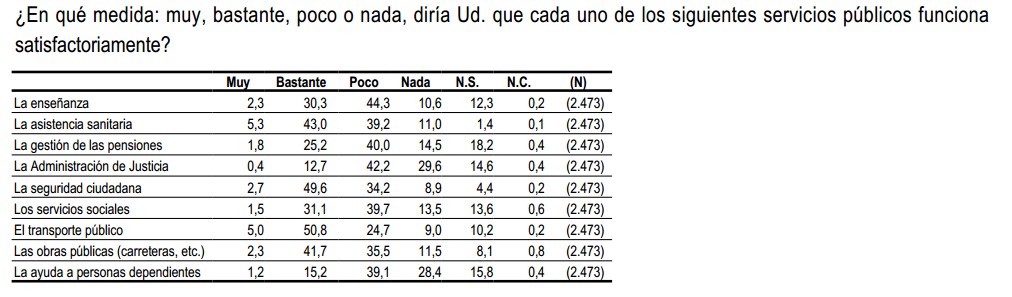 Un 54,9% de los encuestados se muestran poco o nada satisfechos con el funcionamiento de la enseñanza pública frente al 32,6% que responden afirmativamente; el 50,2% valora negativamente la asistencia sanitaria; un 54,5% piensa lo mismo en materia de pensiones; un 71,8% está insatisfecho con la Administración de Justicia; un 53,2% con los servicios sociales; y un 67,5% con la ayuda a personas dependientes. Por el contrario, tan sólo aprueban seguridad ciudadana, transporte público y obras públicas.