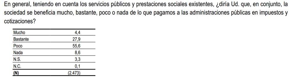 No en vano, si bien el 54% piensa que los impuestos son "necesarios para que el Estado pueda prestar servicios públicos", frente al escaso 10,4% que cree que son "un medio para distribuir mejor la riqueza", más del 64% de los encuestados señala que, en conjunto, la sociedad se beneficia "poco o nada" de lo que pagamos a las administraciones públicas en impuestos y cotizaciones. Es decir, según esta encuesta, los españoles piensan que pagan demasiados impuestos para lo poco y mal que reciben a cambio.