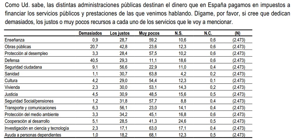 Sin embargo, pese a ello, más de la mitad de los encuestados cree que el Estado dedica "muy pocos" recursos a los principales servicios públicos, como es el caso de educación, desempleo, sanidad, cultura, vivienda, pensiones, I+D+i o ayuda a dependencia.