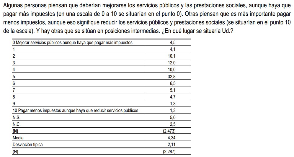 La naturaleza del español medio muestra ciertas contradicciones, al menos en lo que se refiere a la valoración del sector público y el pago de impuestos. Por un lado, la mayoría de la población cree que los servicios públicos son caros e ineficientes y que, además, pagan muchos impuestos para sufragarlos, pero, al mismo tiempo, consideran que algunas de esas partidas, como sanidad, educación, pensiones o desempleo, deberían reforzarse con más recursos públicos, abogando así por nuevas subidas fiscales en caso necesario.