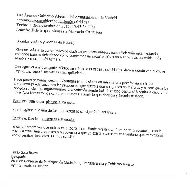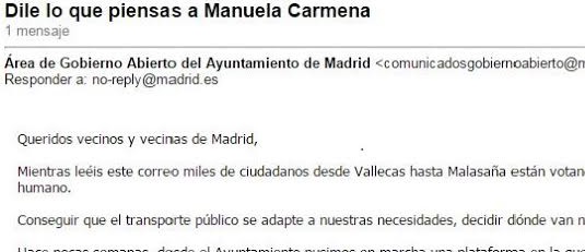 Como explicó Libertad Digital, el mensaje remitido desde el consistorio lo firma Pablo Soto y tiene como asunto "Dile lo que piensas a Manuela Carmena":