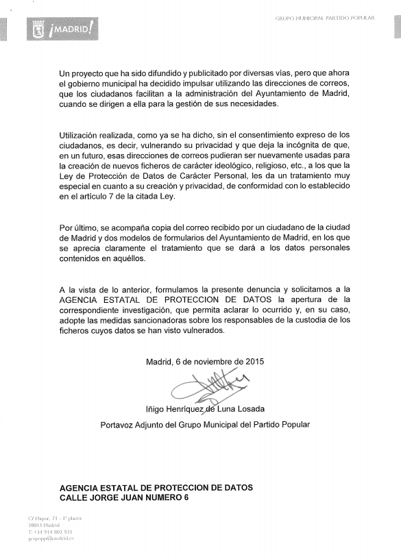 Como respuesta a esta situación, el primer partido de la oposición en el Ayuntamiento madrileño ha denunciado a la Administración Carmena ante la Agencia Española de Protección de Datos, el organismo público creado en 1993 que vela por el cumplimiento de la LOPD.