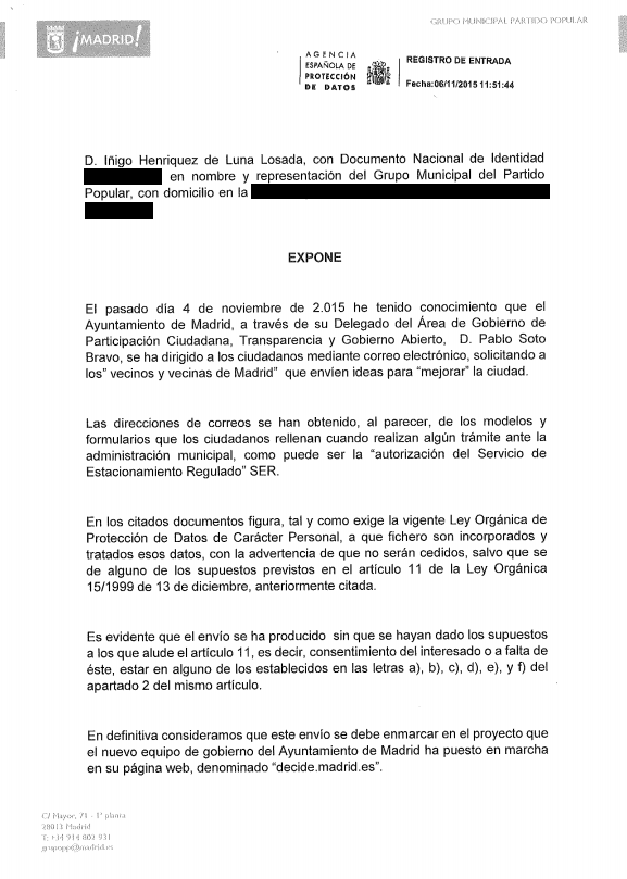 Los temores que expresaba este periódico en relación con la Ley Orgánica de Protección de Datos (LOPD) se han visto confirmados en las últimas semanas. Y es que, según ha denunciado el grupo municipal del PP, el gobierno de Ahora Madrid está utilizando la agenda de correos electrónicos del consistorio para difundir mensajes sobre "Madrid Decide".
