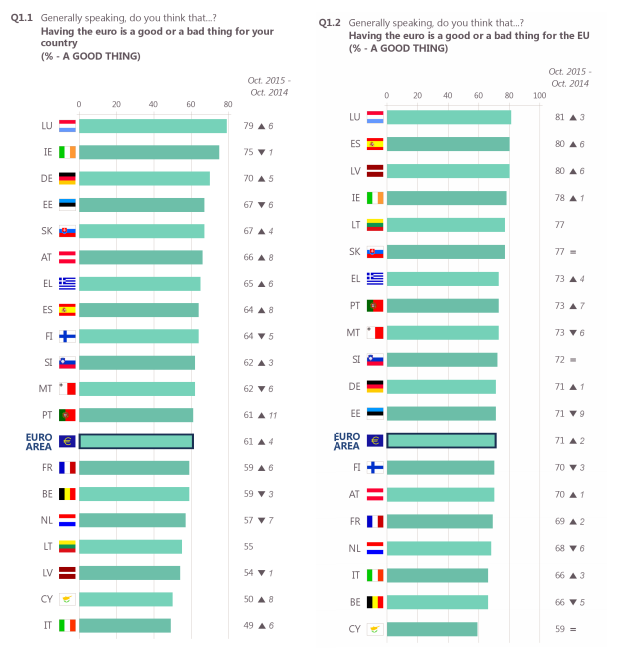 Si en 2014 el respaldo al euro llegaba al 57%, en 2015 nos encontramos con un porcentaje de aprobación del 61%. Esta cota es la más alta que se ha registrado desde 2002, año en que la Comisión Europea empezó a seguir esta cuestión.