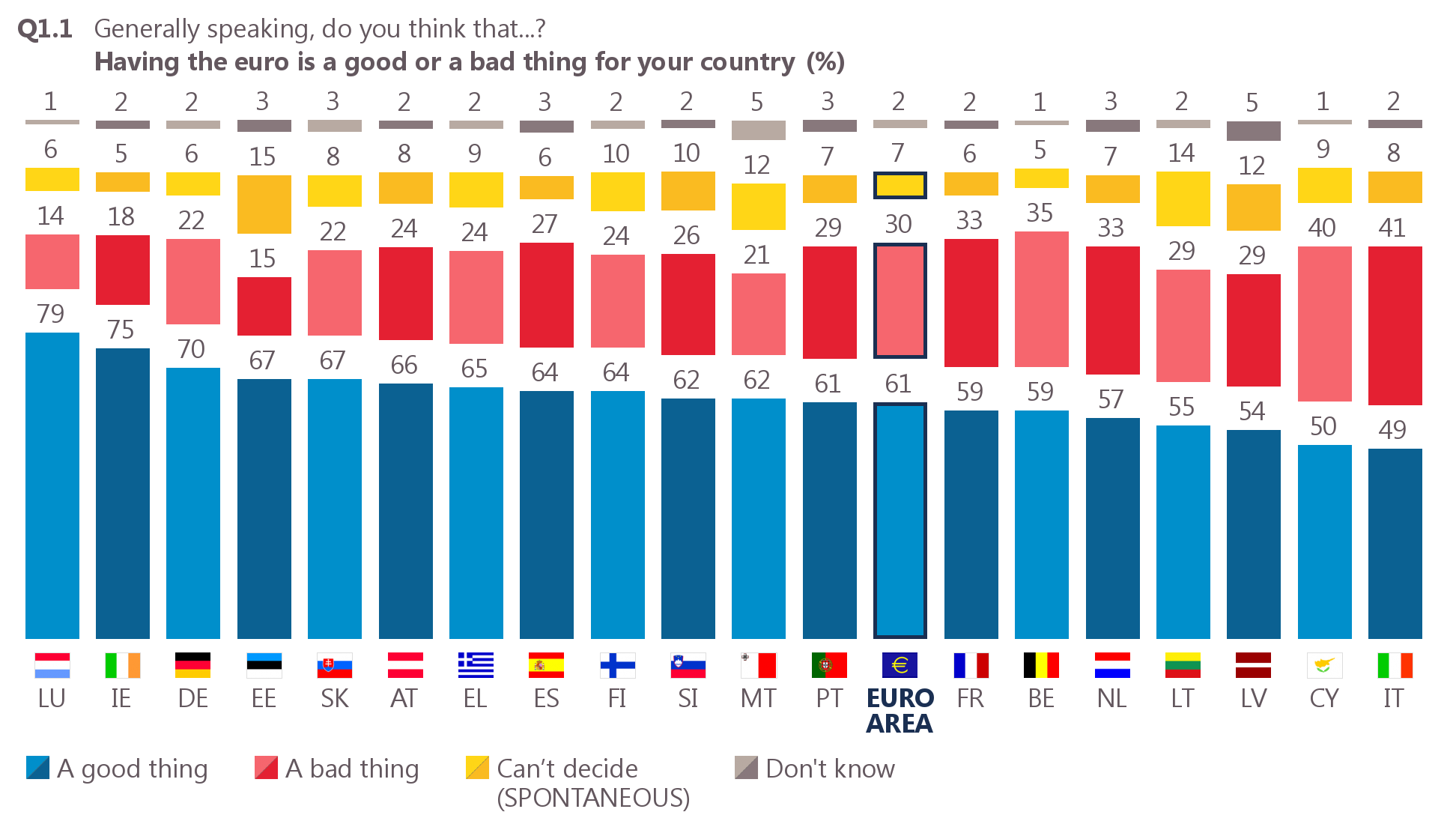 Lo que sí está claro es que los españoles creen que la divisa común es buena para la UE. Un 80% tiene esta opinión, el porcentaje más alto de toda la Eurozona después de Luxemburgo.