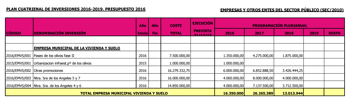 En el proyecto de presupuesto de 2016 se anuncia que las aportaciones a la EMVS ascenderán a 85 millones de euros. Esto significa un aumento del gasto del 24% en comparación con el último presupuesto de la Administración Botella. Está previsto que la EMVS cierre 2015 con un capital vivo de 186 millones de euros.