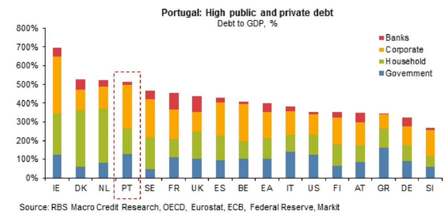En este sentido, cabe recordar que, si bien la deuda pública de Portugal ronda el 127% del PIB, inferior, por tanto, a la griega, la suma de la deuda bancaria y de familias y empresas supera el 500% del PIB frente al 400% de Grecia. Su situación financiera es, pues, muy vulnerable.