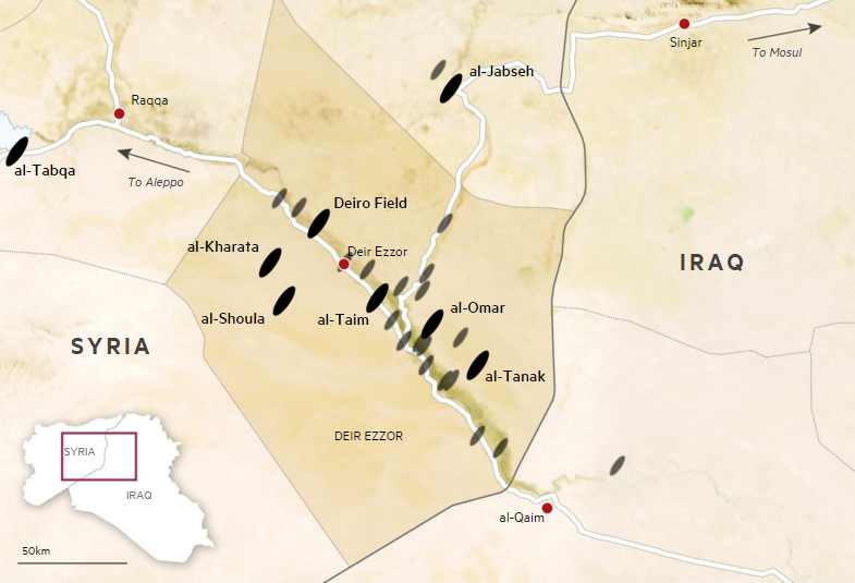 Los dos campos petroleros más importantes para el Estado Islámico son los de al-Tanak y al-Omar. El primero aún es capaz de producir unos 16.000 barriles de crudo al día, mientras que el segundo se mueve en el entorno de los 11.000.