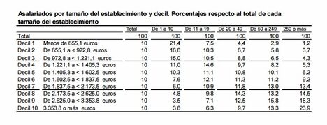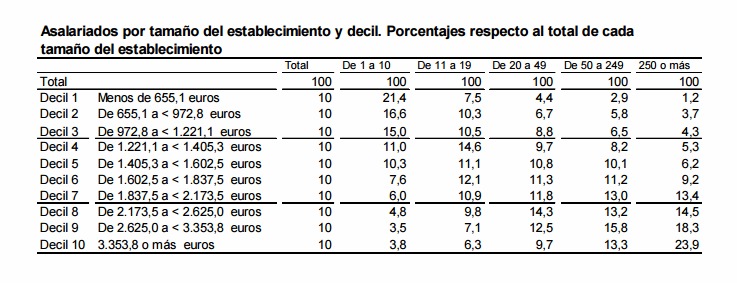 El siguiente cuadro está sacado de la encuesta Decil de salarios del empleo principal que el INE publicó hace unos días. Como puede verse, sólo el 3,8% de los trabajadores en empresas de menos de 10 empleados está en el decil más elevado y cobra más de 3.353 euros. En cambio, en las compañías de más de 250 empleados, casi uno de cada cuatro trabajadores (23,9%) está por encima de esa cifra. Como explica Juan Ramón Rallo, en su artículo Grandes sueldos, grandes empresas: "Según una muy extendida narrativa, lo que han hecho las grandes empresas durante los últimos años ha sido despedir a los trabajadores mejor pagados para contratar a empleados muy mal pagados. La última encuesta de salarios publicada por el INE echa absolutamente por tierra este prejuicio: no sólo las grandes empresas pagan mejores salarios que las pymes, sino que son las que más los han aumentado durante los últimos diez años".