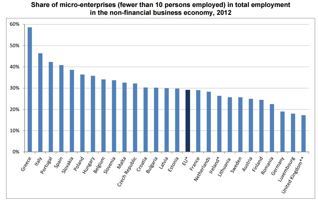 De hecho, somos el cuarto país de la UE con más porcentaje de la fuerza laboral empleado en estas pequeñas empresas (de menos de 10 trabajadores, las llamadas micro-pymes): sólo nos superan Grecia (58,6%), Italia (46,4%) y Portugal (42,3%). En el lado contrario de la clasificación, Reino Unido (17,3%), Luxemburgo (18%) y Alemania (19%).