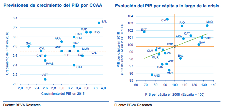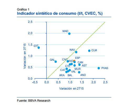 El servicio de estudios de BBVA pronostica que el crecimiento de Madrid en 2015 será del 3,6%, mientras que en 2016 ascenderá al 3,1%. Según el informe, "el aumento del gasto de las familias madrileñas ha sido particularmente elevado si se compara con el de otras comunidades autónomas".