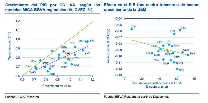BBVA Research espera que España crezca un 3,2% en 2015 y un 2,7% en 2016. Este positivo avance del PIB se apoyaría en el buen comportamiento de las exportaciones y de la demanda interna, si bien no todas las regiones evolucionarán de igual modo.