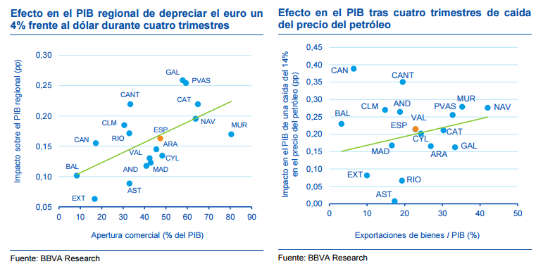 El estudio también muestra qué comunidades se benefician más de la depreciación del euro o qué regiones salen mejor paradas del abaratamiento del petróleo: