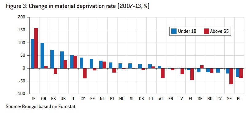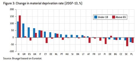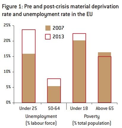 Como podemos ver, en el conjunto de la UE, en 2007, las dos cifras eran similares: 18% de ratio de privación material para los menores de 18 años y 16% para los mayores de 65. A partir de ese momento, la cosa cambia. Entre los jóvenes, la cifra ha subido por encima del 20%, entre los mayores, ha caído por debajo del 15%.