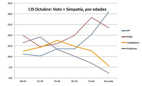 Como puede verse, las diferencias son muy llamativas. Esos jóvenes sin expectativas de los que hemos hablado a lo largo del artículo se han lanzado en brazos de la nueva política, sobre todo de la más radical. Podemos es el partido con mejores expectativas electorales entre los menores de 35 años y Ciudadanos lo hace muy bien entre los menores de 45 años. Enfrente, el PP sólo lidera los sondeos entre los mayores de 65 (aunque sólo con el liderato en esa franja de edad ya le sirve para encabezar las encuestas); y el PSOE, aunque algo mejor entre los veinteañeros, también tiene su caladero más importante entre los mayores de 55 años.