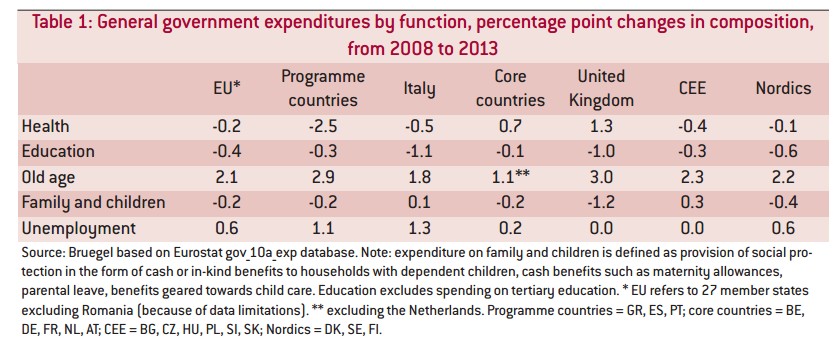 En este punto, serán muchos los que se pregunten por qué precisamente en España estas tendencias son tan acusadas. Hay muchas razones, pero no podemos obviar que hay un componente político en estas cifras. Las decisiones que toman los diferentes gobiernos importan. Nuestro país ha sufrido una crisis de déficit y deuda públicos que ha obligado a recortar el gasto de las administraciones. Ante esta tesitura general se ha priorizado el gasto dedicado a los mayores. Y algo parecido han hecho el resto de los gobiernos europeos (ver cuadro con la evolución de las diferentes partidas de gasto público durante la crisis).