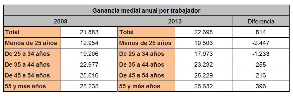 En este sentido, es fácil comprobar que la mayor parte de la carga de la crisis se la están llevando los jóvenes. Esta realidad no sólo se circunscribe a los menores de edad y los jubilados (que son los que aparecen en este gráfico). En casi todas las estadísticas de paro, evolución de los salarios, precariedad en el empleo, ingresos,… los menores de 30-35 años tienen peores resultados que los mayores de 45-50. La brecha entre generaciones está creciendo. Por ejemplo, el siguiente cuadro muestra las ganancias medias por trabajador en 2008 y 2013 en diferentes grupos de edad: