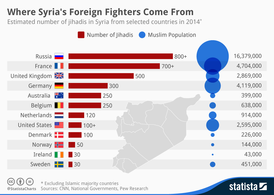 A la hora de abordar esta cuestión, no está de más recordar que, de acuerdo con los datos que se han difundido en los últimos años, el grueso de los combatientes extranjeros que se han unido al Estado Islámico viene de algunos de los países más ricos del mundo. Es el caso de Francia, Reino Unido, Alemania, Australia, Bélgica, Holanda, EEUU, Dinamarca, Noruega, Irlanda o Suecia. Rusia está a la cabeza del listado, y si bien no hablamos de una nación con los niveles de prosperidad de la OCDE, tampoco estamos ante un país del Tercer Mundo.
