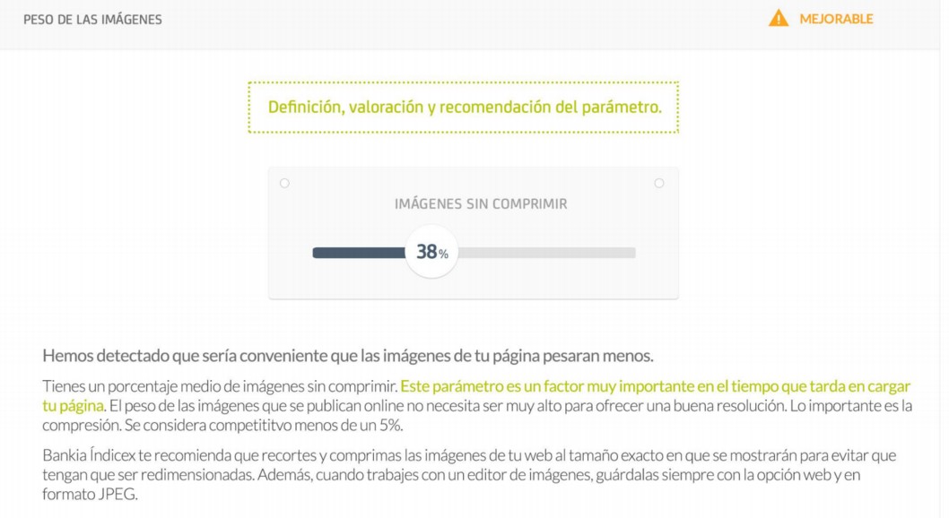 Bankia Índicex también valora la caché del navegador, es decir si los usuarios que visitan tu web por segunda vez no tienen que volver a esperar a que las imágenes se carguen y, por tanto, tienen una mejor experiencia de usuario. En el siguiente ejemplo, se muestran las recomendaciones a una empresa que ha obtenido una calificación de Mejorable en lo referente al peso de las imágenes que aparecen en su portal.