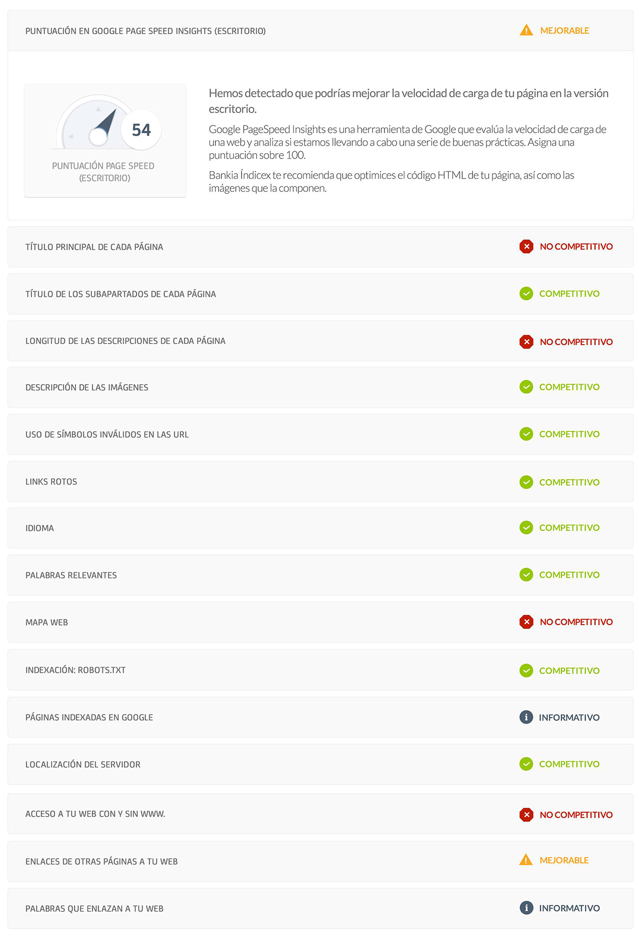 La aplicación analiza ocho áreas de medición, entre las que se encuentra el posicionamiento, y entrega a la empresa un amplio informe para cada área. A través de sus recomendaciones, Bankia Íncidex contribuirá a que tus clientes actuales o futuros te localicen más fácilmente cuando realicen sus búsquedas online.
