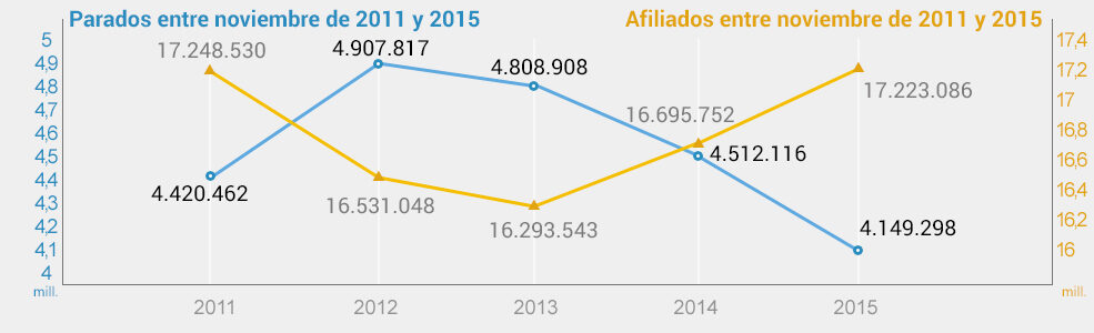 España encadena más de dos años con reducción de paro e incremento de empleo, pero el impacto que tuvo la recesión durante la primera parte de la legislatura arroja un sabor agridulce en materia laboral a la hora de hacer un balance general de toda la legislatura. Así, España cerró noviembre con un total de 4.149.298 parados registrados en el Inem, apenas 271.164 menos que hace cuatro años, cuando se celebraron las últimas elecciones generales.
