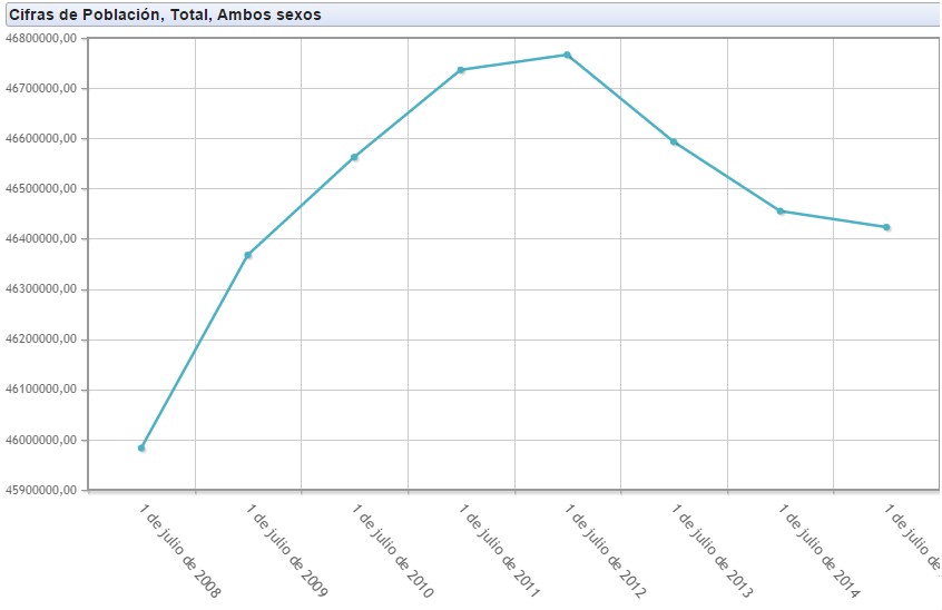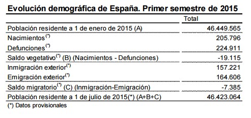 Por un lado, la población residente en España se situó en 46.423.064 habitantes a 1 de julio de 2015, lo que supuso 26.501 personas menos que a comienzos de año. Así pues, continúa el descenso poblacional iniciado en 2012, aunque en los últimos doce meses se ha moderado esta tendencia, desde el 0,12% en el primer semestre de 2014 al -0,06% en el primero de 2015.