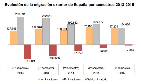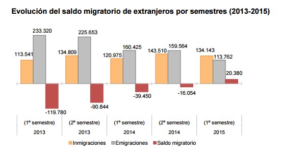 De hecho, durante el primer semestre de 2015, el saldo migratorio de extranjeros fue de 20.380 personas, tornándose positivo por primera vez desde el segundo semestre de 2009, lo cual supone un significativo punto de inflexión. Es decir, hoy por hoy, llegan más extranjeros a España de los que se van, a diferencia de lo que ha sucedido en los últimos años.