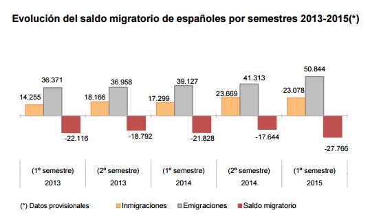 En la primera mitad de 2015 el flujo de emigración de la población de nacionalidad española aumentó un 23,1% respecto al semestre anterior. El 64,9% de los españoles que emigraron eran nacidos en España.