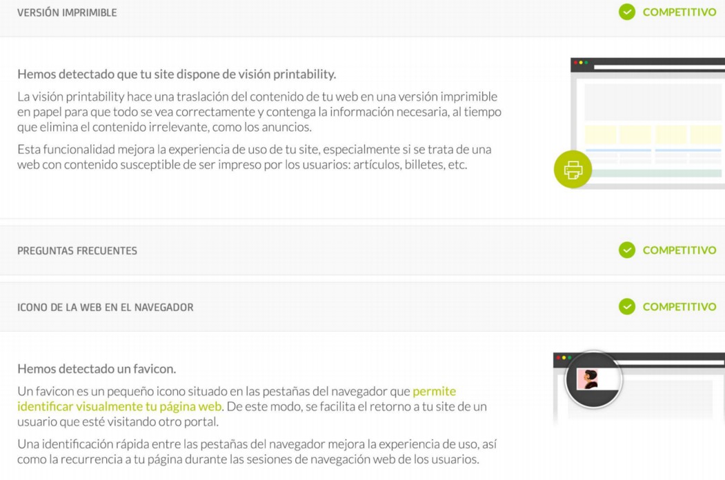 En el siguiente ejemplo, la herramienta evalúa algunos de los elementos más importantes en la Usabilidad de una web. En este caso, califica a la versión imprimible, a las preguntas frecuentes y al icono de la web en el navegador como competitivos.