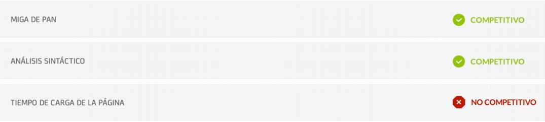 En cuanto a la estructuración de tu página, se detecta si tiene miga de pan. La miga de pan (breadcrumb, en inglés) es una técnica que facilita la navegación dentro de una página web. Así, por medio de una línea de texto, el usuario identifica rápidamente el recorrido que realiza a través del site y no se siente perdido. A diferencia del tiempo de carga, que es no competitivo, esta empresa tiene una miga de pan idónea.
