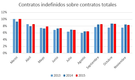 Claro que este mensaje resulta bastante pueril, habida cuenta de que ha sido la contratación en general –debido al mayor crecimiento económico– lo que ha aumentado durante ese mismo período. ¿Verdaderamente observamos alguna diferencia de fondo entre el ritmo de contratación indefinida en estos meses de 2015 con respecto a períodos anteriores? No, en absoluto: el porcentaje de contratos indefinidos en 2015 es prácticamente idéntico al de 2013 y 2014.