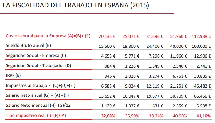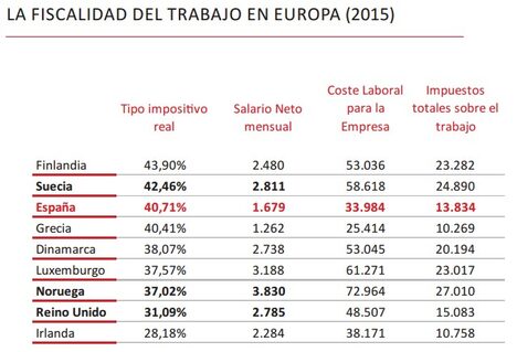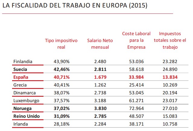 España sufre una fiscalidad sobre el trabajo equiparable a la de los países nórdicos, pero con sueldos mucho más bajos. Igualmente, Dinamarca, Luxemburgo, Noruega o Irlanda son países que, con niveles de renta media también superiores a la española, gravan las rentas del trabajo a unos tipos impositivos más reducidos, entre el 28% y el 38%, respectivamente.