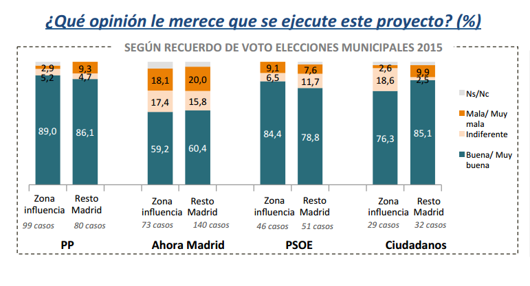 Entre los vecinos de la zona, se repiten los mismos patrones de apoyo. El 89% de los votantes del PP, el 59% de Ahora Madrid, el 84% del PSOE y el 76% de Ciudadanos tienen una buena opinión de la iniciativa, de acuerdo con la encuesta.