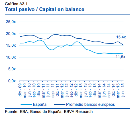 De entrada, vemos que el peso del pasivo sobre el capital de las entidades ha pasado de ser 15 veces mayor en 2010 a niveles de 11,6 puntos en 2015.