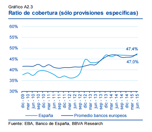 En tercer lugar, vemos que la ratio de cobertura (que incorpora únicamente las provisiones específicas) ha crecido del 40% al 47% en el último lustro. En este indicador, España sí se ha puesto al nivel de la media europea.