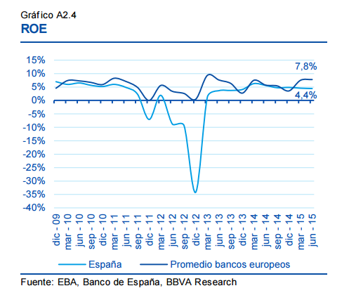 Donde la banca española sigue claramente por debajo de Europa es el ROE, indicador que mide la rentabilidad obtenida por cada entidad sobre sus recursos propios. No obstante, este indicador se mueve entre el 4% y el 5% desde 2013, ompiendo con dos años de tasas negativas.