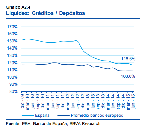 En cuanto a la liquidez, medida como el peso de los créditos sobre los depósitos, vemos que la redimensión del sector ha sido notable: pasa de una cuota del 150% en 2010 a rondar el 115% en 2015.