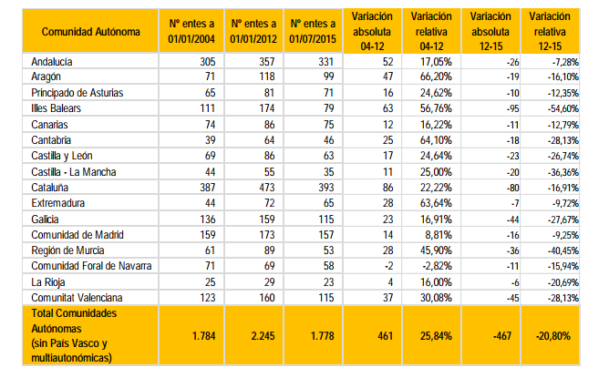 Por encima de la barrera de los 100 entes nos encontramos con la Comunidad de Madrid (157), Galicia (115) y Comunidad Valenciana (115). En el extremo opuesto está Castilla-La Mancha, que ha pasado de 55 a 35 organismos entre 2012 y 2015.