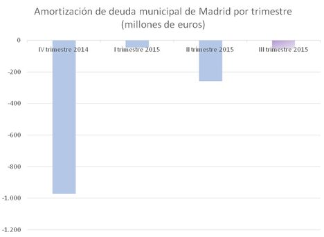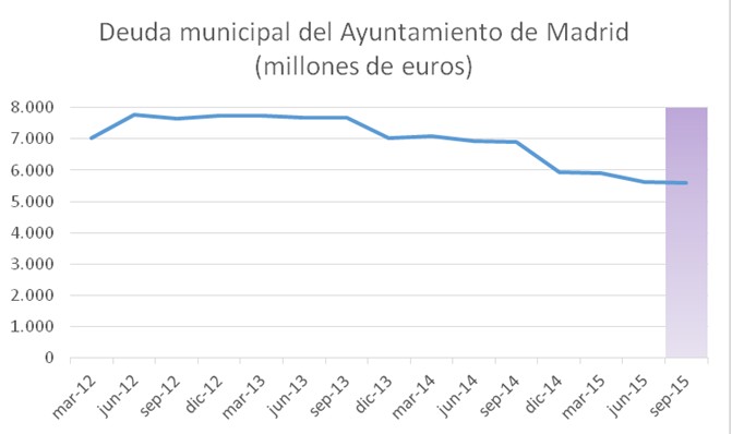 Primero, la deuda municipal sí se ha reducido un 19,1%, pero lo ha hecho con respecto al tercer trimestre de 2014: en concreto, a cierre de septiembre de 2014, la deuda municipal de Madrid ascendía a 6.907 millones de euros y, al finalizar septiembre de 2015, se reduce hasta los 5.583 millones. Por consiguiente, la reducción de la deuda es imputable a los últimos doce meses previos a septiembre de 2015, y recordemos que Ahora Madrid tomó las riendas del ayuntamiento a mediados de junio.